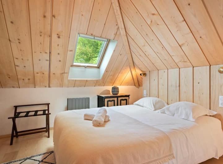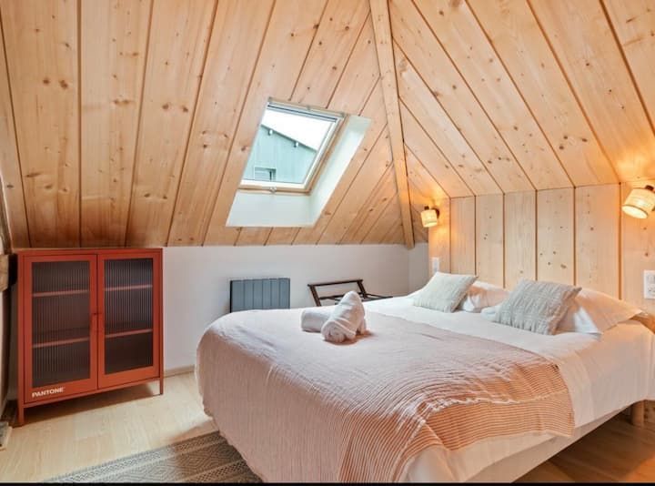 Dès votre arrivée à l'étage, vous serez séduits par les volumes généreux et l'atmosphère chaleureuse des lieux. L'espace de vie, entièrement privatisé pour votre confort, a été conçu pour garantir la tranquillité de chaque hôte.