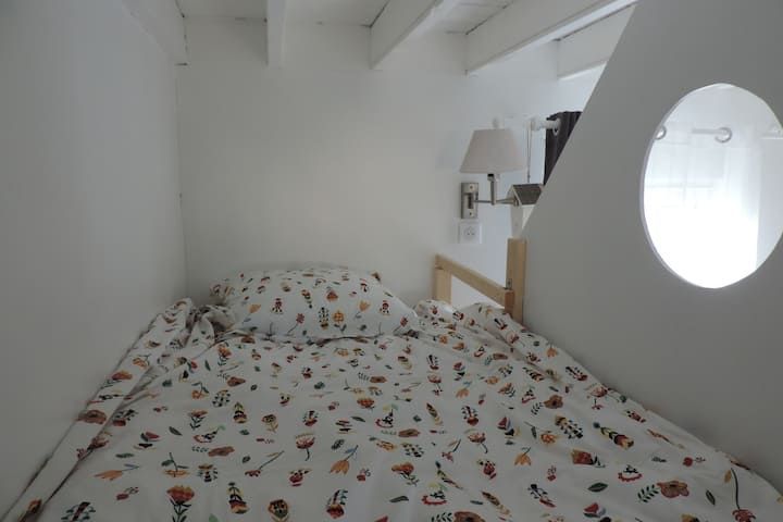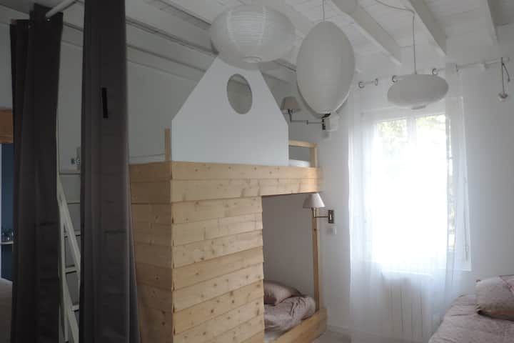 À l’étage, une grande chambre parentale avec lit double 160x200 et une chambre palière fermée par des rideaux occultants proposant trois couchages un lit simple et deux lits superposés cabane
