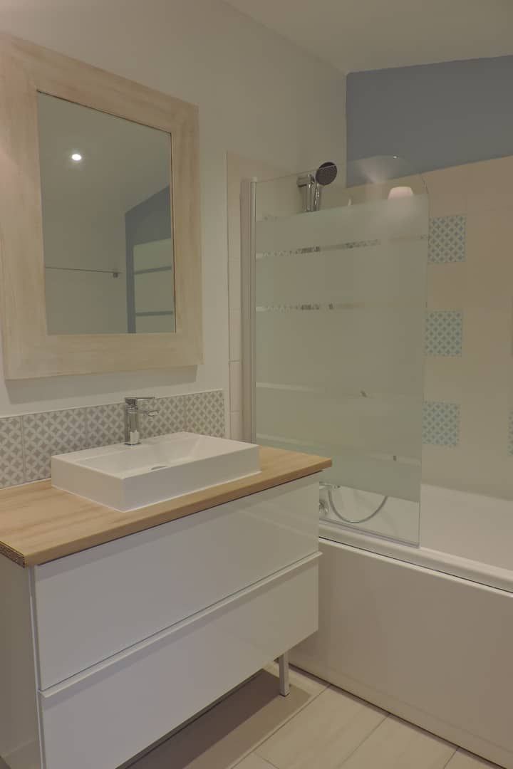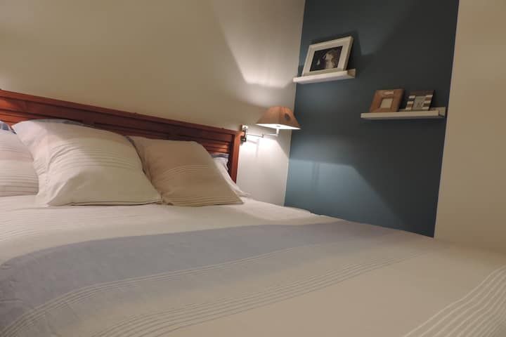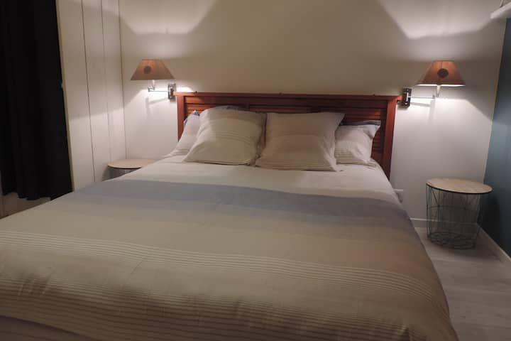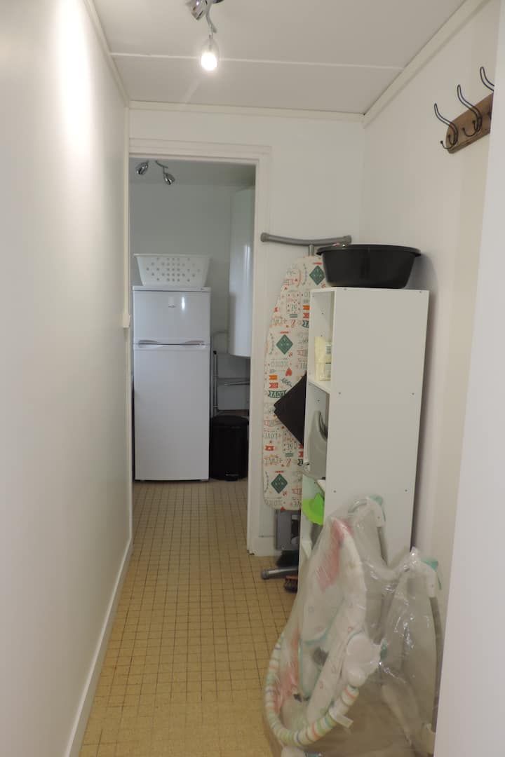 Au rez de chaussée, vous profitez d’un salon confortable avec télévision ainsi que d’une cuisine entièrement équipée avec four, micro ondes, plaque induction, lave vaisselle, réfrigérateur avec congélateur et lave linge dans l’arrière cuisine, petit électroménager à disposition cafetière bouilloire grille pain et mixeur
