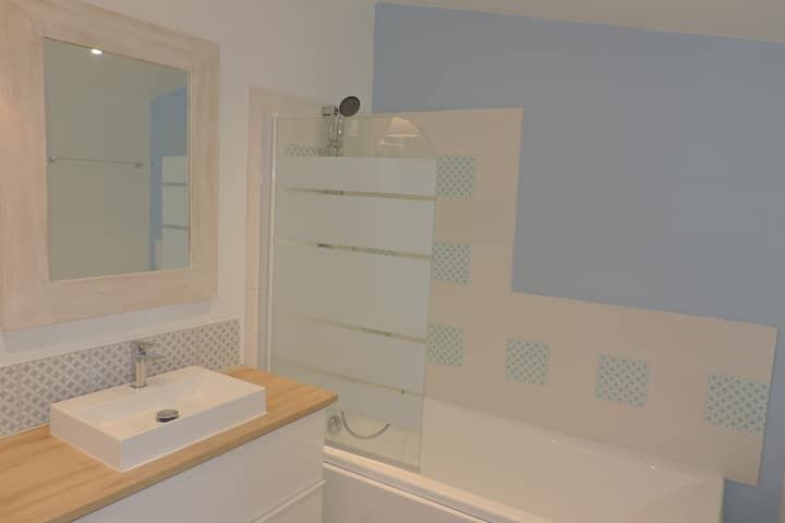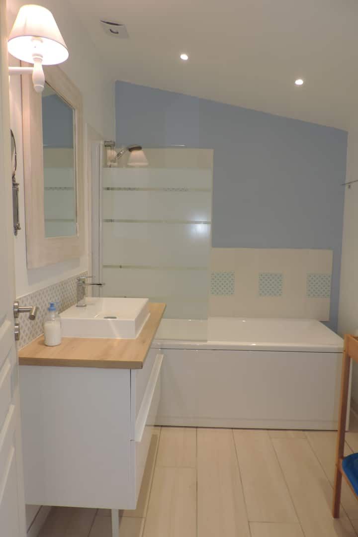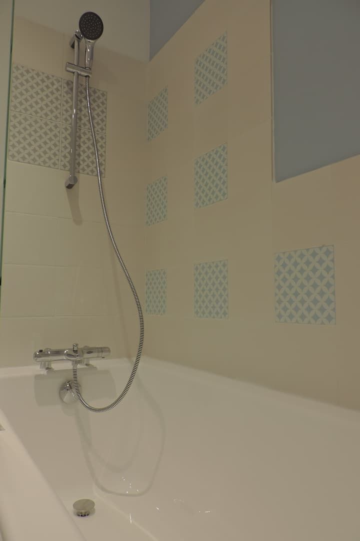 Vous trouverez également des WC séparés et une salle de bain avec baignoire équipée d’un pare baignoire, sèche serviettes et sèche cheveux