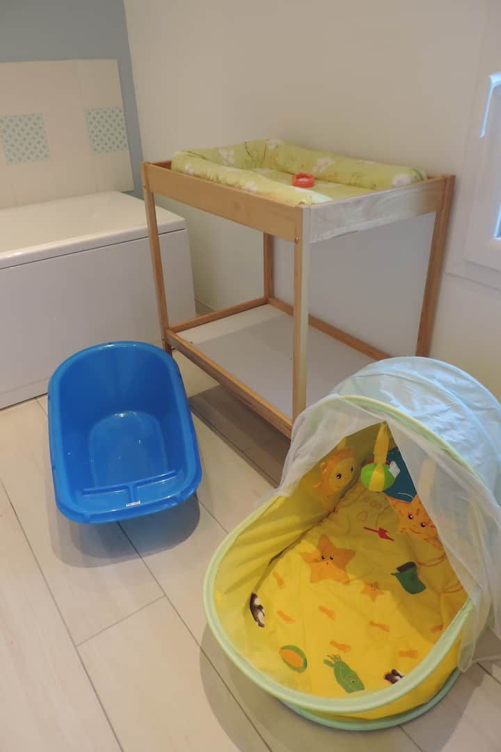 Pour les familles avec bébé, de nombreux équipements sont fournis lit parapluie chaise haute plan à langer transat baignoire pot et adaptateur WC avec marche